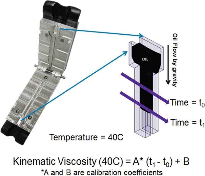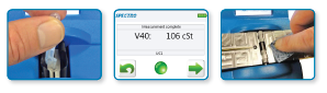 MiniVisc 3000粘度計采用開合式(Split-Cell)毛細管樣品池專利設計,測量運動粘度只使用幾滴油(60μl)。當樣品池閉合時,中心會形成一個毛細管式形通道,有100微米的空隙,油由于重力作用向下流動。油流經特定位置時會觸發傳感器,兩個傳感器被激發的時間差會被測量出來。由此,可計算出油的運動粘度。當樣品池打開時,用一個清潔棉紙進行擦拭,為下一個樣品測試做準備。在整個檢測過程中,樣品池的溫度始終控制在40℃。
